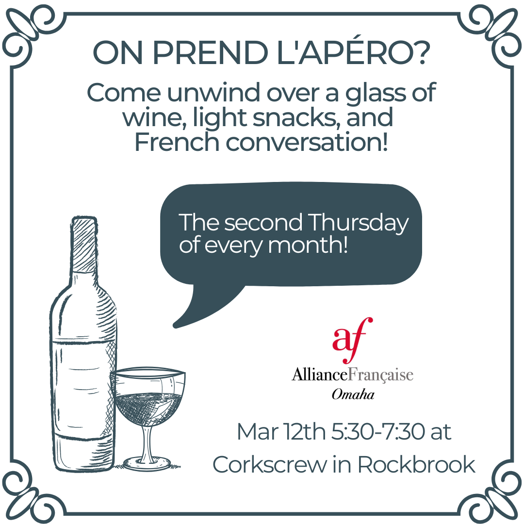 Apéro mars Thursday, March 12, 2026 5:30 PM 7:30 PM Corkscrew in Rockbrook 10924 Prairie Brook Rd. Omaha (map) Google Calendar ICS Venez nous rejoindre pour participer à notre apéro et parler en français ! Nous vous invitons à profiter de cette soirée hors du commun, qui reflète les qualités de nos membres et de nos invités. Vous êtes tous les bienvenus !